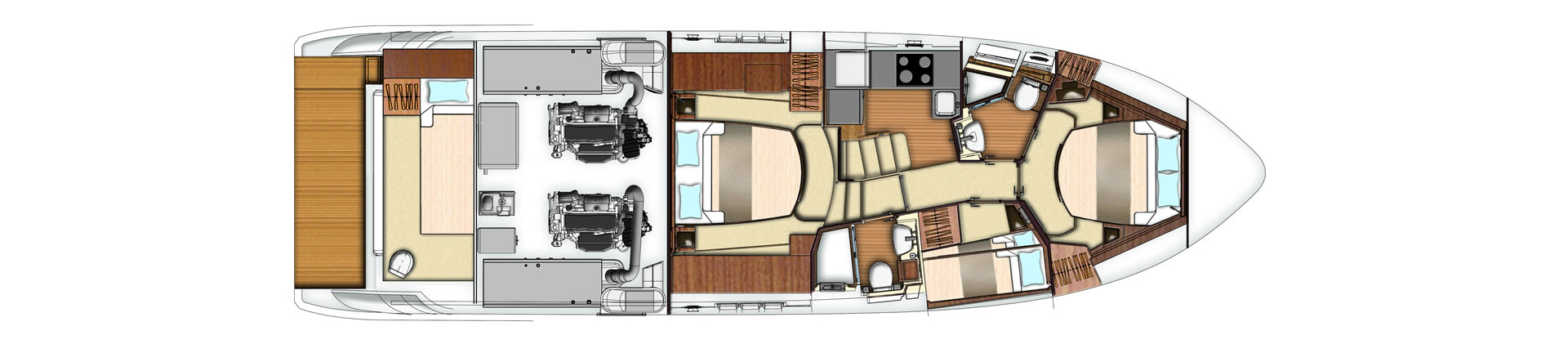Interior of the new 50-foot Azimut include a saloon, dining area with relaxation area, below deck galley, and lobby leading to the cabins. Owner’s cabin is in the center and the VIP cabin is towards the bow. Thanks to the sizeable interiors, space has also been found for a third cabin with two pullman beds.