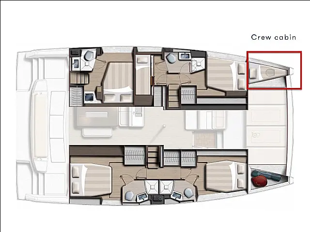 A prua c'è una crew cabin da un lato e bagno con doccia dall'altro lato