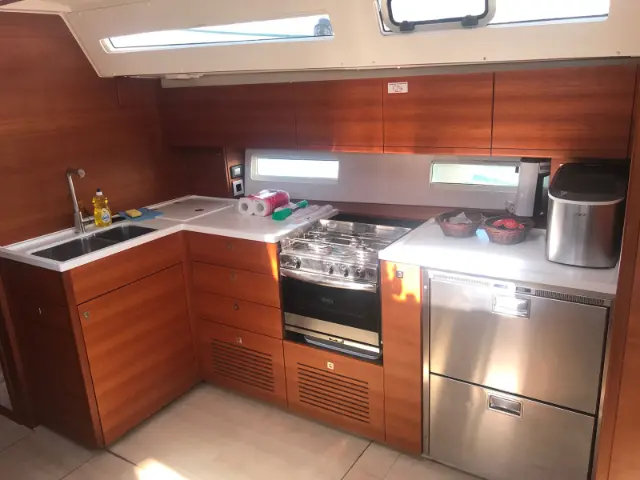 Dinghy, Cockpit cushions, Sprayhood, Teak Cockpit, Swimming platform, Electric winches, Air condition, Generator, Inverter, Coffee maker, Ice maker, Refrigerator, Bimini, Electric toilet, Heating, Wi-Fi & Internet, Cockpit speakers Autopilot, Chart plotter in cockpit, Radar Radio-CD player, Snorkeling equipment