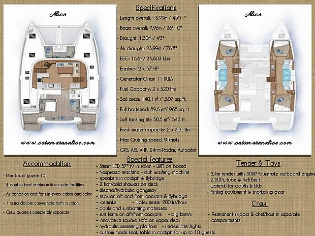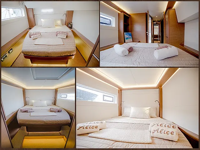 Wifi equipment (unlimited): 0.00 € per person, Changing Linen every 3 Days: 0.00 € per booking, End cleaning: 0.00 € per booking, Floating Mats: 0.00 € per booking, Stand Up Paddle (3 sets): 0.00 € per booking, Snorkel Gear: 0.00 € per booking, Commission, 2 members of crew ( Captain and Hostess), daily room service, changing linen every three days, welcome drinks and meze, the first 15GB of internet: 0.00 € per booking, Water Skis-Kids: 0.00 € per booking, Fishing Gear (2 sets): 0.00 € per booking, "Noodles": 0.00 € per booking, Daily room service: 0.00 € per booking, Water Skis-Adult: 0.00 € per booking, Welcome Drinks: 0.00 € per booking, Inflatable Tubes: 0.00 € per booking, Dinghy (7 pax) 30hp: 0.00 € per booking, Complimentary amenities: 0.00 € per booking, Beach Games: 0.00 € per booking, Sea Scooters (2 items): 0.00 € per booking, Hair Dryers: 0.00 € per booking, Kayaks 2 pax: 0.00 € per booking, Kayaks 1 pax: 0.00 € per booking, Captain, chef/hostess : 0.00 € per booking, Wakeboard: 0.00 € per booking