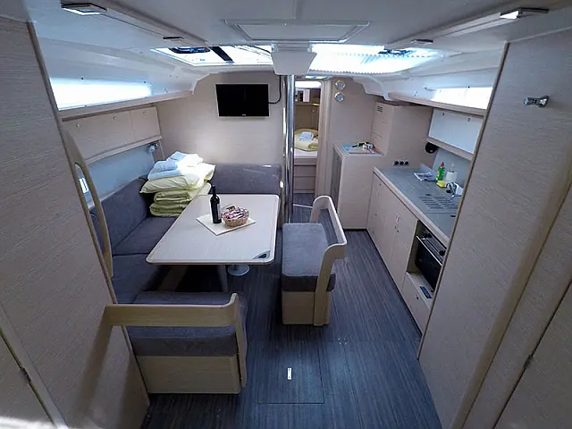 Perfect layout with owner’s front double cabin with ensuite toilet + 2 double cabins + bunk cabin and separate toilet in the back, large cockpit with bathing platform and with fridge, grill and sink in cockpit.