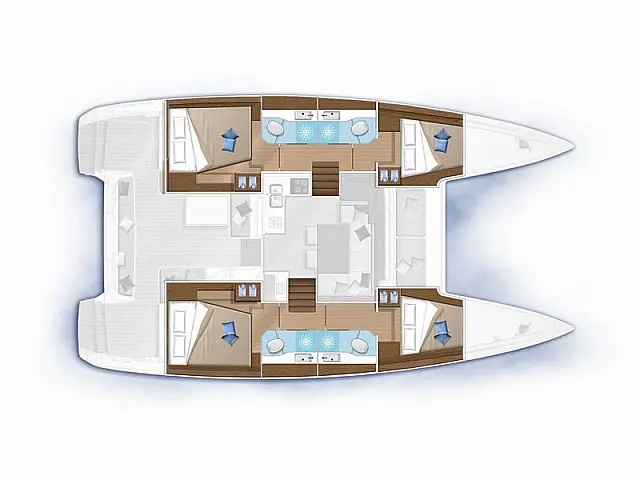 New boat from 2024, 4 double cabins + 2 single bow cabins + 2 salon berths, 4 toilets/showers, equipped with solar panels.