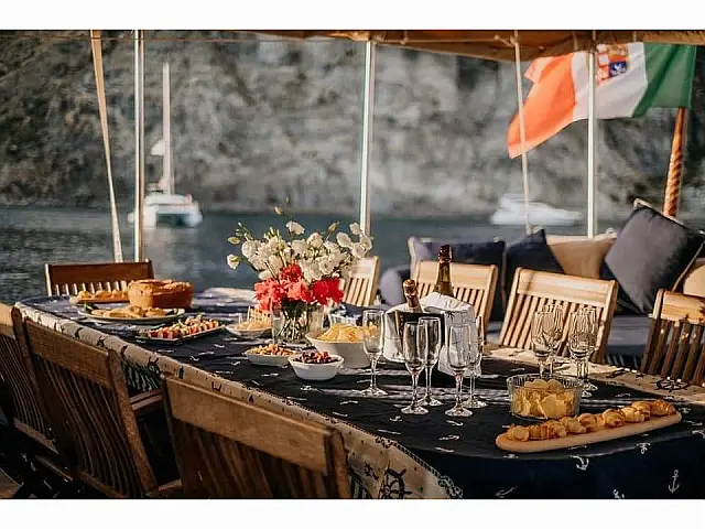 Harbour fees: 600.00 € per week, Fuel for 4 hours sailing per day, using water and equipment on board (fishing gear, snorkeling, etc, if available) : 0.00 € per booking, Final cleaning included: 0.00 € per booking, Insurance of the yacht, wages and food for the crew, service on board, cabins' daily cleaning : 0.00 € per booking, Generator working hours for the air condition is limited to 4/6 hrs a day (no use during the night) : 0.00 € per booking, Bed sheets and towels a change per week, sun towels, free WiFi: 0.00 € per booking, 3 Italian crew (skipper, cook, sailor/maid) : 0.00 € per booking, Italian VAT: 0.00 € per booking