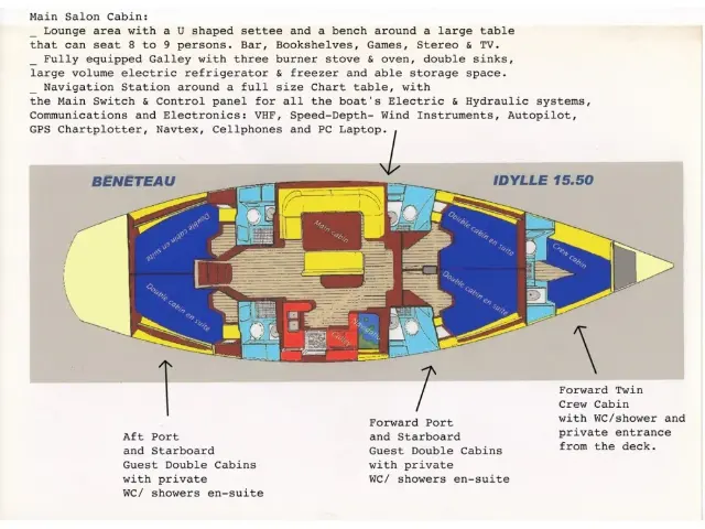 Sprayhood, Bimini, Cockpit speakers, Inverter, Solar Panels, Dinghy Bow thruster, Autopilot, Chart plotter, Radar TV, DVD player