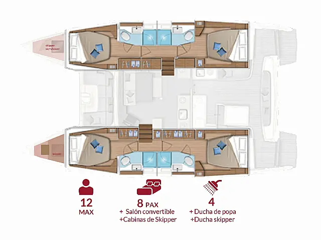 | Cabins: | 4 + CONVERTIBLE SALOON + 1 CREW FOREPEAK CABIN |