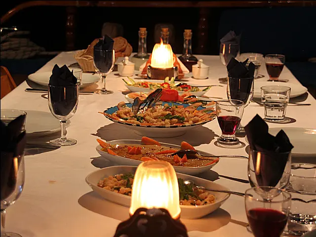 Hamam towel : 0.00 € per booking, Fishing Gear: 0.00 € per booking, Bathroom towels: 0.00 € per booking, Large Bathing towel & Shower towels: 0.00 € per booking, Safety Deposit Box: 0.00 € per booking, WIFI on board: 0.00 € per booking, Bluetooth Speaker: 0.00 € per booking, RIB Tender with Yamaha Outboard: 0.00 € per booking, 2 x SUP's, Stand Up Peddle-board's: 0.00 € per booking, Independent Airconditioning : 0.00 € per booking, Ultra All inclusive Catering on board. Food & Beverages (incl. wine and beer) € 465,00 pp. (KIDS UNDER 17 HAVE DISCOUNT !): 465.00 € per person/week, Canoe: 0.00 € per booking
