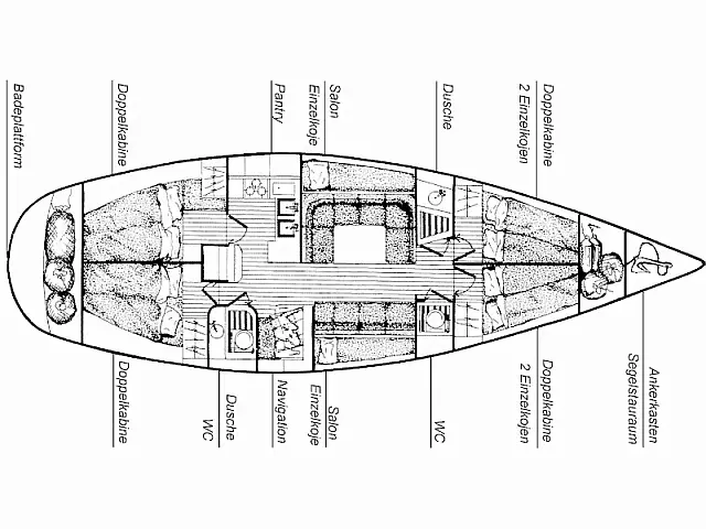 Autopilot, Radar, Chart plotter Radio-CD player Heating, Bimini, Swimming platform, Refrigerator, Dinghy, Outboard engine, Sprayhood