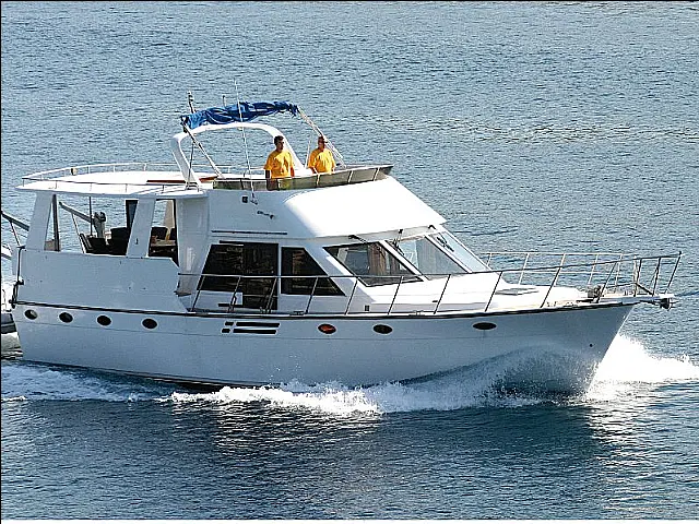 This yacht is equipped with a hydraulic gangway, bow thruster, autopilot, generator and