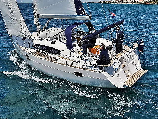 Our Elan 444 Impression 'Sagitta' is a perfect boat for groups who like good sailing performance and adventure, ideal for escaping from crowded beaches and spots in the high season and exploring the secret bays of nearby islands. Located in marina Dalmacija Sukošan in the central Dalmatia, this boat can host up to ten persons in four cabins with practical salon and two bathrooms with showers. Accept the challenge and sail away with your family or friends and start from National park Kornati, Nature park Telašćica and reach the south of Croatian coast and islands of Brač, Hvar or Korčula.