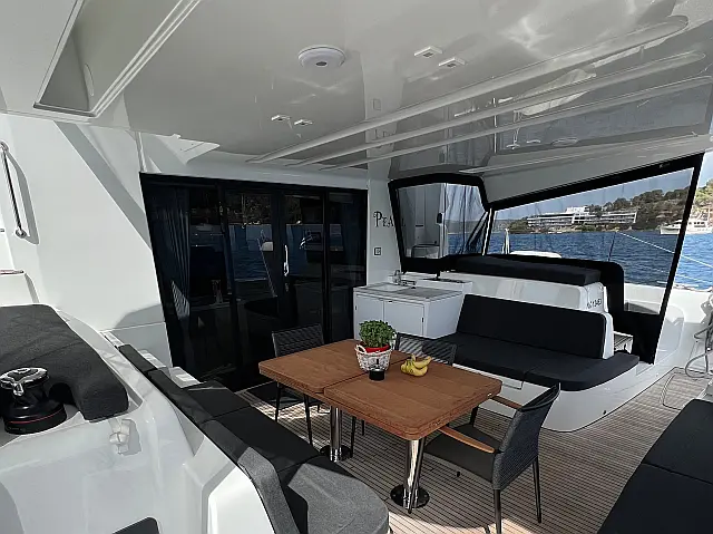 Lazy bag Solar Panels, Water maker, Air condition, Bimini, Sprayhood, Refrigerator, Inverter, Electric winches, Dinghy, Hydraulic gangway, Electric toilet, Holding tank, Generator Autopilot, Chart plotter Radio-CD player, TV
