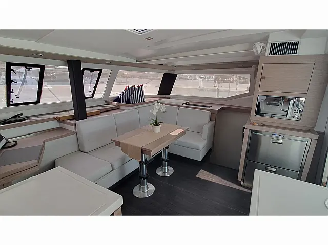Underwater lights Autopilot, Chart plotter, Radar Generator, Holding tank, Air condition, Heating, Water maker, Coffee maker, Dinghy, Electric toilet, Inverter, Bimini, Cockpit speakers, Teak Cockpit, Cockpit cushions, Refrigerator, Barbecue grill in cockpit Radio-CD player Lazy bag, Lazy jack
