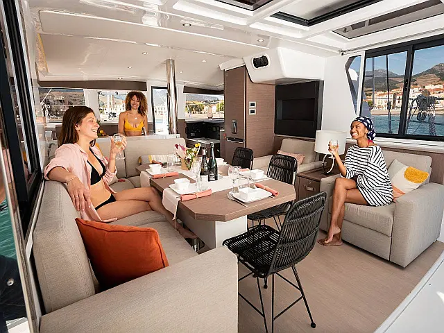 Lazy jack, Lazy bag Bimini, Barbecue grill in cockpit, Coffee maker, Air condition, Generator, Water maker, Electric winches, Dinghy, Electric toilet, Refrigerator, Flybridge, Cockpit cushions, Solar Panels, Cockpit speakers Chart plotter in cockpit, Chart plotter, Autopilot Stand up paddle, Snorkeling equipment