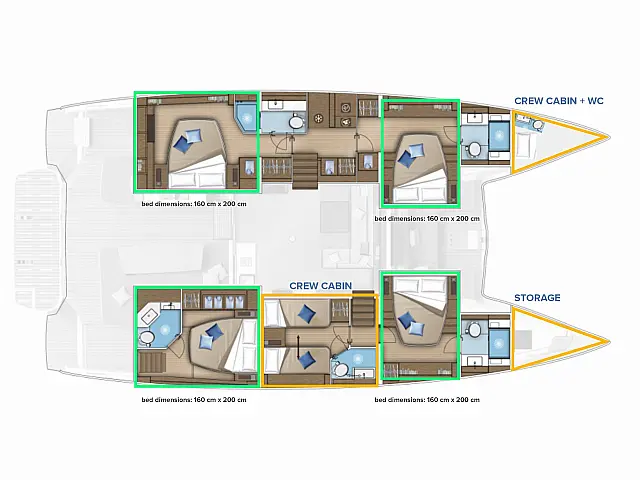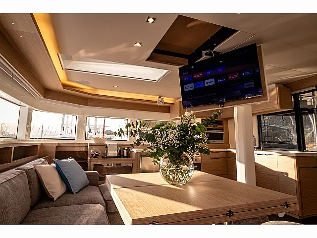 Hydraulic gangway, Teak Cockpit, Barbecue grill in cockpit, Electric winches, Teak deck, Air condition, Refrigerator, Generator, Inverter, Water maker, Dinghy, Coffee maker, Dishwasher, Ice maker, Cockpit cushions, Solar Panels, Wi-Fi & Internet Autopilot, Radar Lazy bag Stand up paddle, Snorkeling equipment, Radio-CD player, TV