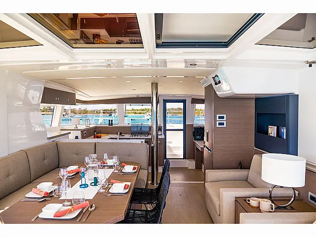 Lazy jack, Lazy bag Bimini, Barbecue grill in cockpit, Coffee maker, Air condition, Generator, Water maker, Electric winches, Dinghy, Solar Panels, Electric toilet, Refrigerator, Flybridge, Cockpit cushions, Cockpit speakers Chart plotter in cockpit, Chart plotter, Autopilot Stand up paddle, Snorkeling equipment