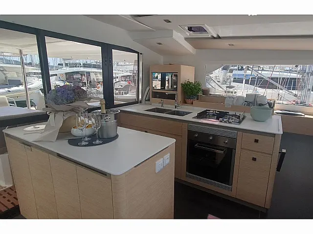 Underwater lights Cockpit cushions, Generator, Heating, Water maker, Coffee maker, Washer/Dryer, Dinghy, Electric winches, Inverter, Electric toilet, Bimini, Cockpit speakers, Teak Cockpit, Refrigerator, Hydraulic gangway, Barbecue grill in cockpit Autopilot, Chart plotter, Radar Radio-CD player, TV Lazy bag, Lazy jack
