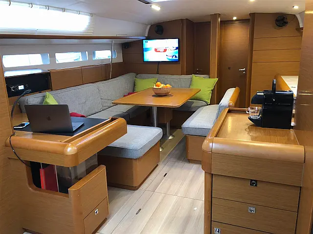 Sprayhood, Wi-Fi & Internet, Generator, Outboard engine, Cockpit cushions, Electric toilet, Bimini, Cockpit speakers, Heating, Holding tank, Electric winches, Air condition, Inverter, Teak Cockpit, Swimming platform, Refrigerator, Dinghy, Coffee maker, Solar Panels DVD player, TV, Snorkeling equipment Autopilot, Bow thruster, Chart plotter in cockpit Lazy bag