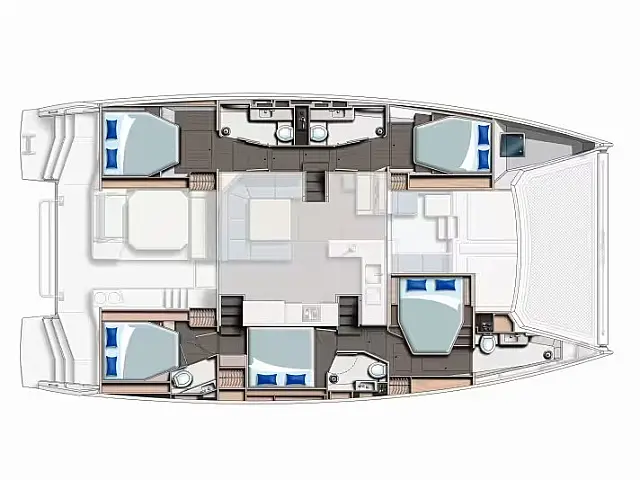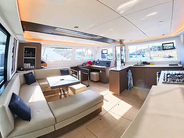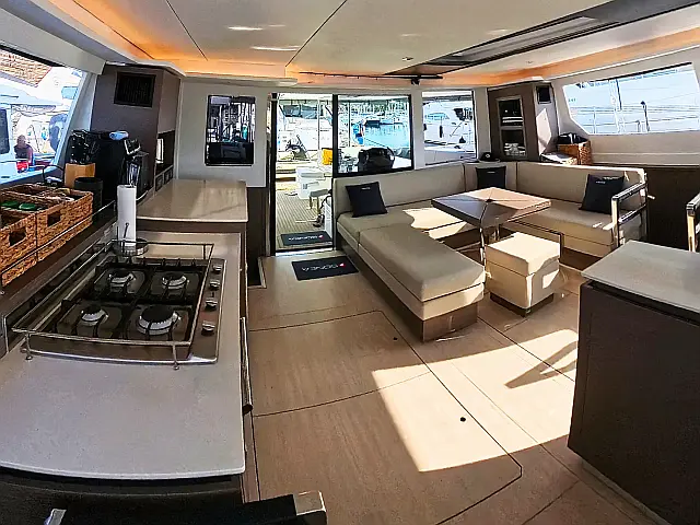 Cockpit cushions, Flybridge, Ice maker, Electric winches, Swimming platform, Bimini, Tenderlift platform, Dinghy, Barbecue grill in cockpit, Teak Cockpit, Coffee maker, Dishwasher, Refrigerator, Electric toilet, Washer/Dryer, Air condition, Generator, Heating, Inverter, Solar Panels, Water maker, Wi-Fi & Internet Lazy bag Autopilot, Chart plotter, Radar Radio-CD player, Snorkeling equipment, Stand up paddle, TV Underwater lights