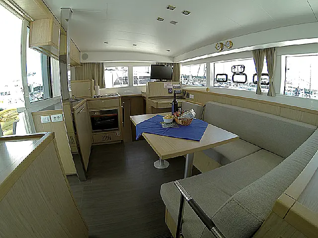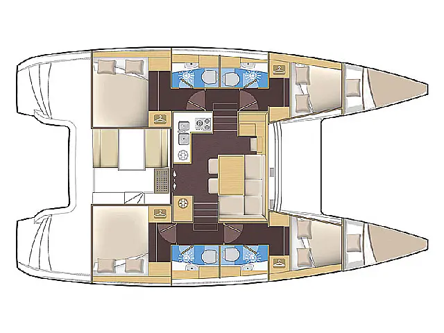 This catamaran has 4 double cabins + 2 single in the bow, 2 salon berths and 2 bathrooms.