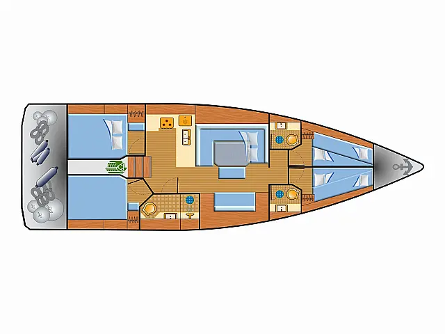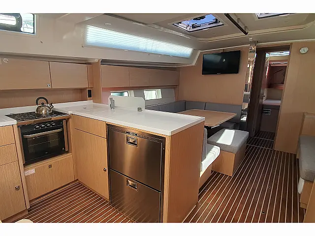 Hladnjak, Wi-Fi i internet, Klima, Bimini, Pomoćni čamac, Crni tank, Sprayhood, Jastuci u kokpitu, Generator, Roštilj u kokpitu, Tikovina u kokpitu Radio-CD player, TV Pramčani propeler, Autopilot