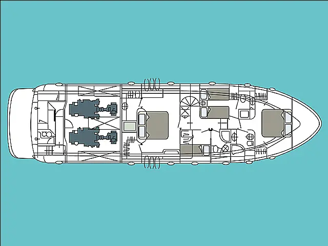 Autopilot, Radar, Ploter karata, Pramčani propeler Bimini, Hladnjak, Generator, Hidraulučna pasarela, Pomoćni čamac, Vanbrodski motor, Grijanje, Desalinizator, Ledomat, Električna vitla, Aparat za kavu, Električni WC, Paluba od tikovine, Wi-Fi i internet, Roštilj u kokpitu, Inverter, Tikovina u kokpitu, Jastuci u kokpitu, Klima, Flybridge TV, Radio-CD player