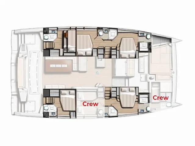 | Kabine: | 5 GUESTS: 5 double cabins (1 twin beds, 1 bunk) CREW: cabin + WC in forepeak, 1 double aft stern cabin + WC |