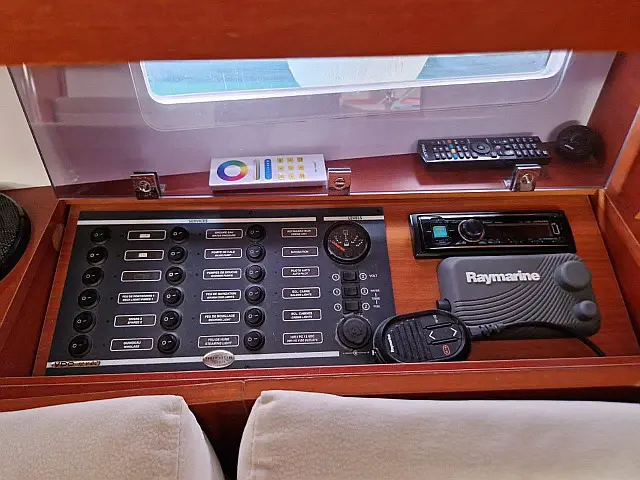 Radar, Ploter karata, Autopilot Bimini, Pomoćni čamac, Hladnjak, Grijanje, Sprayhood, Solarni paneli TV, Radio-CD player