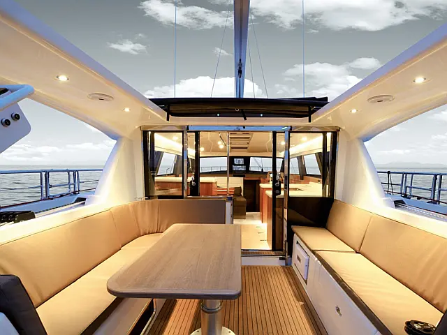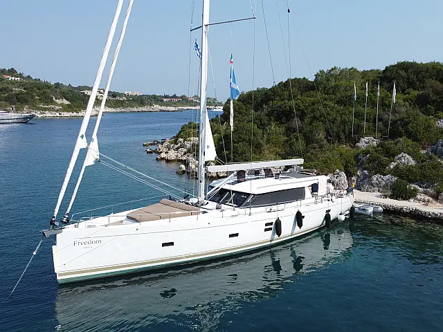 Grijanje, Platforma za plivanje, Paluba od tikovine, Klima, Generator, Desalinizator, Bimini, Aparat za kavu, Jastuci u kokpitu, Električna vitla, Hladnjak, Solarni paneli, Pomoćni čamac Autopilot, Pramčani propeler, Ploter karata, Radar Oprema za ronjenje na dah, TV