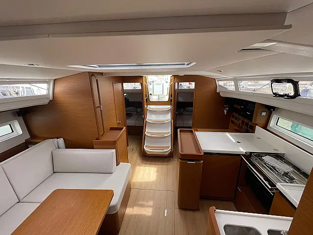 Bimini, Pomoćni čamac, Hladnjak, Solarni paneli, Paluba od tikovine Lazy jack Autopilot, Ploter karata u kokpitu Radio-CD player